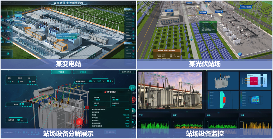 利用数字孪生技术,构建数字化站场1:1三维数字地图并与物理数据信息要素进行匹配,在平台内直观呈现升压站真实场景,实现物理世界向孪生世界的精准映射,其中包含:站场周边环境地形、 站内设备、建筑、绿植道路等设施,重点还原站内一次设备和二次设备及区域等要素,并支持对上述要素进行统一管理及展示。