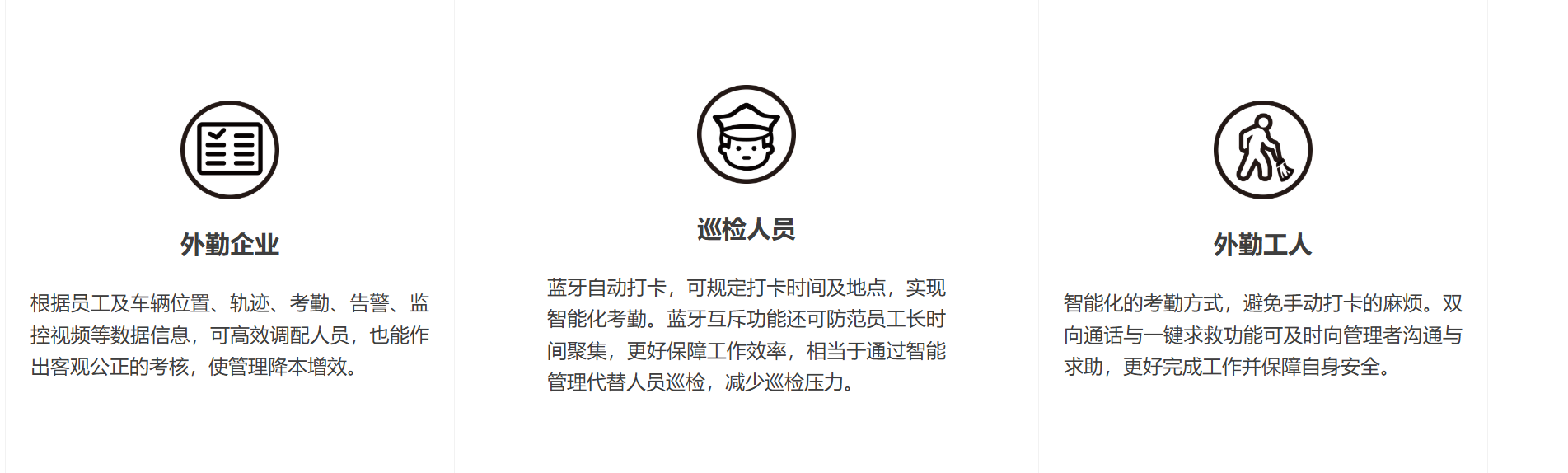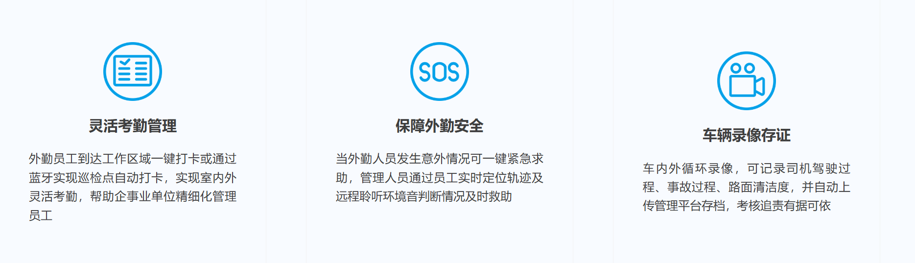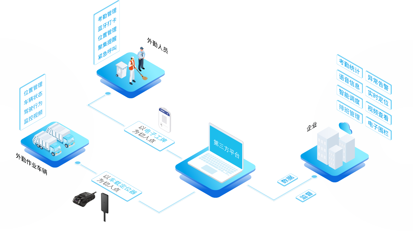 银基智能提供专门为智慧外勤打造的IoT管理解决方案,以物联网智能终端作为通讯入口,采集外勤车辆及外勤员工状态(位置、轨迹、告警信息、车内外监控等)。 一方面管理者可高效监管外勤员工与司机驾驶,实现智能调度、协同作业、无纸化考核、高效排班,以优化管理成本,另一方面外勤员工可通过电子工牌完成 智能打卡、危险情况一键求救等,外勤车驾驶员可通过车辆告警与行车录像等,为自己的工作安全和合理考勤增加保障。