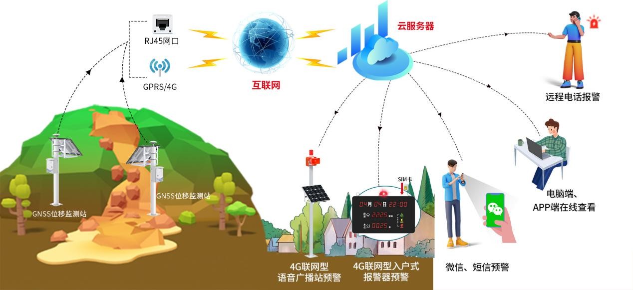 GNSS形变监测预警系统由GNSS位移监测站(包括基准站和测量站)、差分定位信息解算服务器以及综合环境监控云平台组成,主要为边坡、大坝、桥梁、基坑 等容易倾斜、位移或者形变的场所提供实时安全监测及预警服务。系统采用高度集成的一体化设备GNSS位移监测站,实时监测所在区域的地质情况并实现自动 报警。通过差分定位信息解算服务器整合分析各监测点数据,掌握整个地质情况,并及时进行排险调度。相关管理人员可借助该系统做到常监测、早预警、早 准备,对可能因倾斜、位移或者形变出现地质灾害的地方做出相应的安排处理,减少地质灾害发生的几率,同时对邻近区域的群众做好预警疏散工作,以减少 群众的经济损失、保障群众的人身安全。