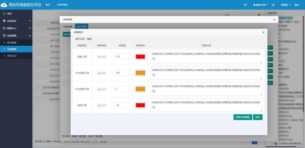 支持所有监测因子报警上限、下限,预警上限、下限设置,支持因子数据异常字体变色,因子告警数据颜色用户可自定义。