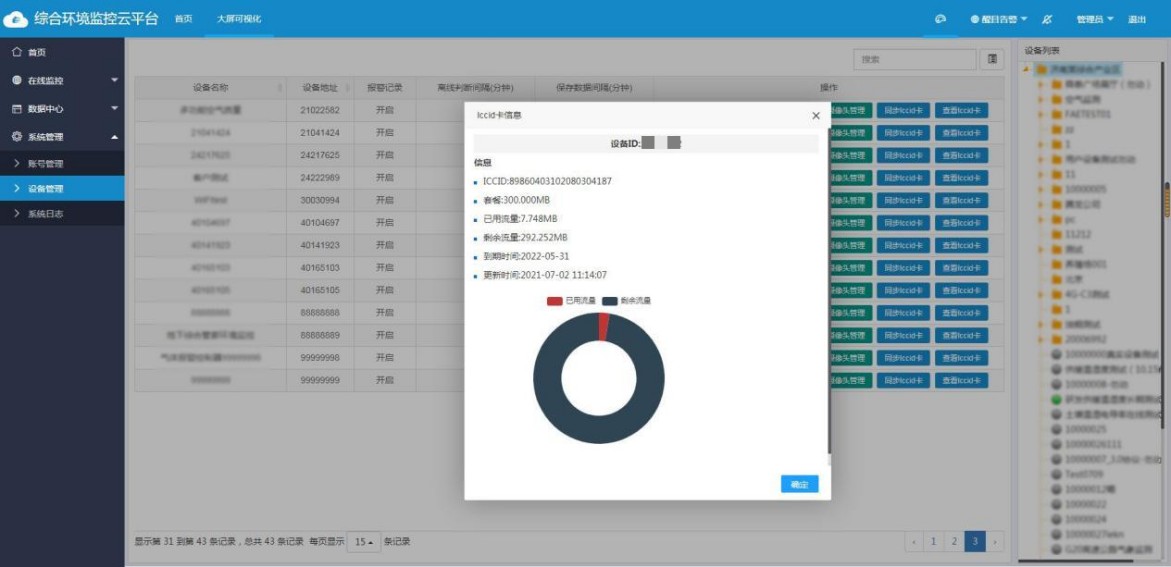 实时获取现场4G型物联网设备的卡号,自动分析卡号剩余流量,自动分析,到期时间预警提醒,让项目管理人员及时充值,防止流量卡到期运营商销号造成项目停滞。