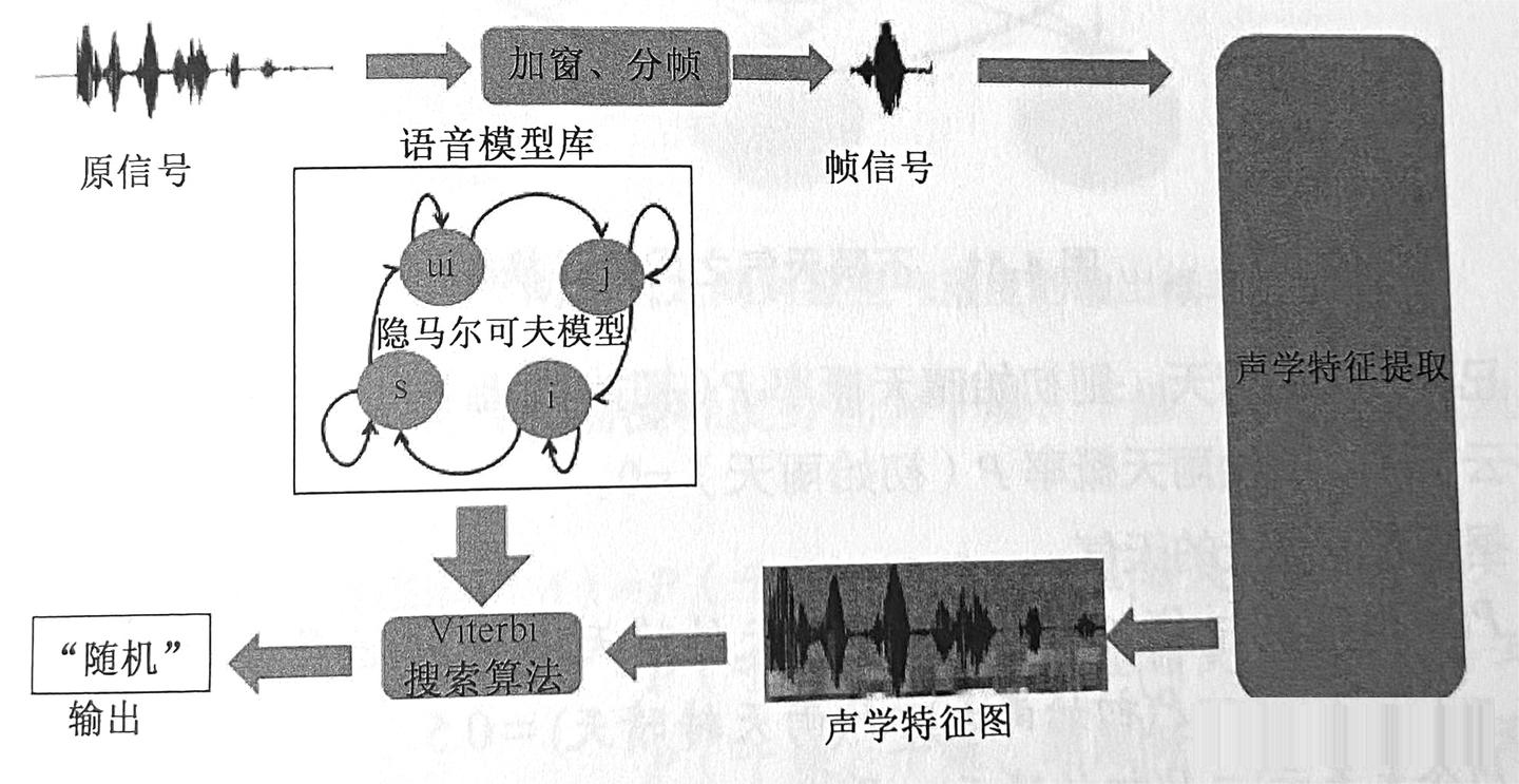 除了存储音素,语音模型库还存储了大量单字、单词、成语等语句元素所对应的语音输出概率。例如,当接收到语音信号“sui ji”时,这个信号识别为“随即”二字的概率为0.3,识别为“随机”