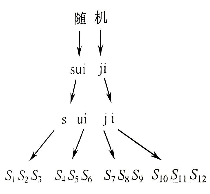 在上图中,以中文单词“随机”为例,将其拆分为音素“s”“ui”“j”“i”,并由此生成对应的状态路径S₁→S₂→S₃→S₄→Ss→S₆→S₇→Sg→S₉→S₁o→S₁→S12。