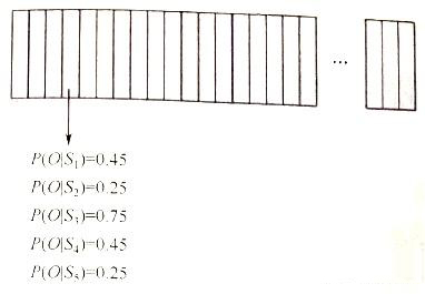 例如,若当前的天气情况不能直接获得,只能通过测量空气湿度间接获得。同样以天气预测为例,不同天气之间对应空气湿度的输出概率如下图所示。